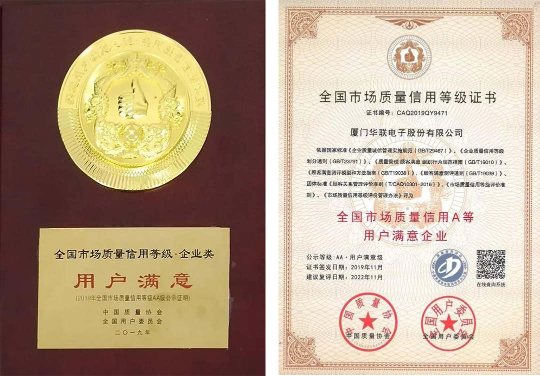 近日,中國質量協(xié)會、全國用戶委員會在珠海聯(lián)合舉辦“2019滿意中國年會”,會上發(fā)布2019年全國市場質量信用A等用戶滿意企業(yè)名單。名單依據《企業(yè)質量誠信管理實施規(guī)范(GB/T29467)》、《企業(yè)質量信用等級劃分通則(GB/T23791)》等多項國家標準選評,廈門華聯(lián)電子股份有限公司成功入選,公示等級為AA級。這已是華聯(lián)電子第四次獲得本項殊榮。
