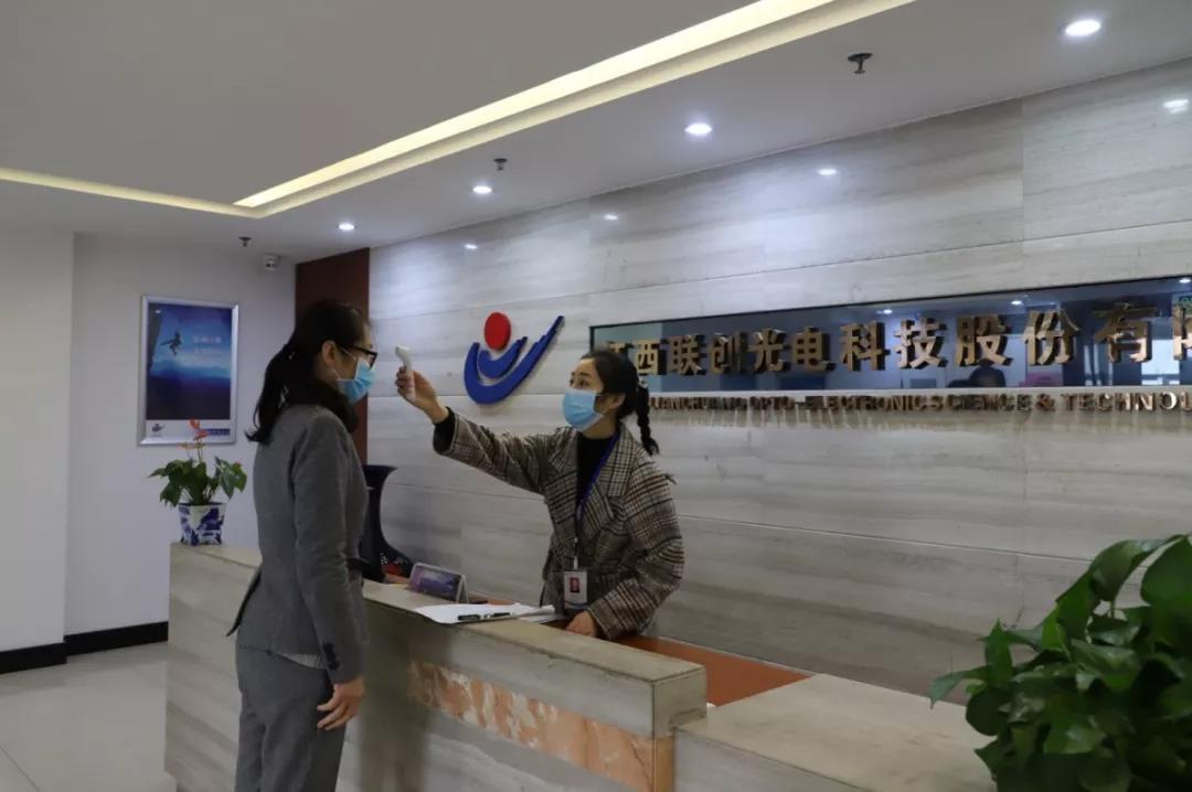 聯(lián)創(chuàng)光電科技園區(qū)實(shí)施封閉式管理,人員及車輛需憑核發(fā)的出入證進(jìn)出園區(qū)。園區(qū)東門崗和南門崗分別設(shè)立體溫檢測(cè)點(diǎn),對(duì)所有人員進(jìn)行實(shí)名制身份證查驗(yàn)、體溫測(cè)量和信息登記,堅(jiān)決杜絕體溫異常人員進(jìn)入園區(qū)和生產(chǎn)、公共辦公場(chǎng)所。
