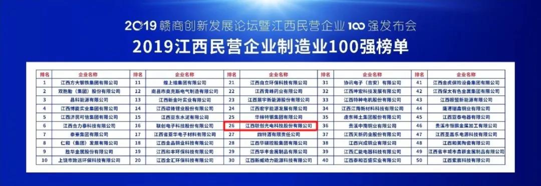 會(huì)上發(fā)布了2019江西民營企業(yè)100強(qiáng)、2019江西民營企業(yè)制造業(yè)100強(qiáng)名單,聯(lián)創(chuàng)光電均上榜,分別位列江西民營企業(yè)100強(qiáng)第49位、江西民營企業(yè)制造業(yè)100強(qiáng)第26位。聯(lián)創(chuàng)光電常務(wù)副總裁葉建青代表公司參會(huì)并領(lǐng)取獎(jiǎng)牌。