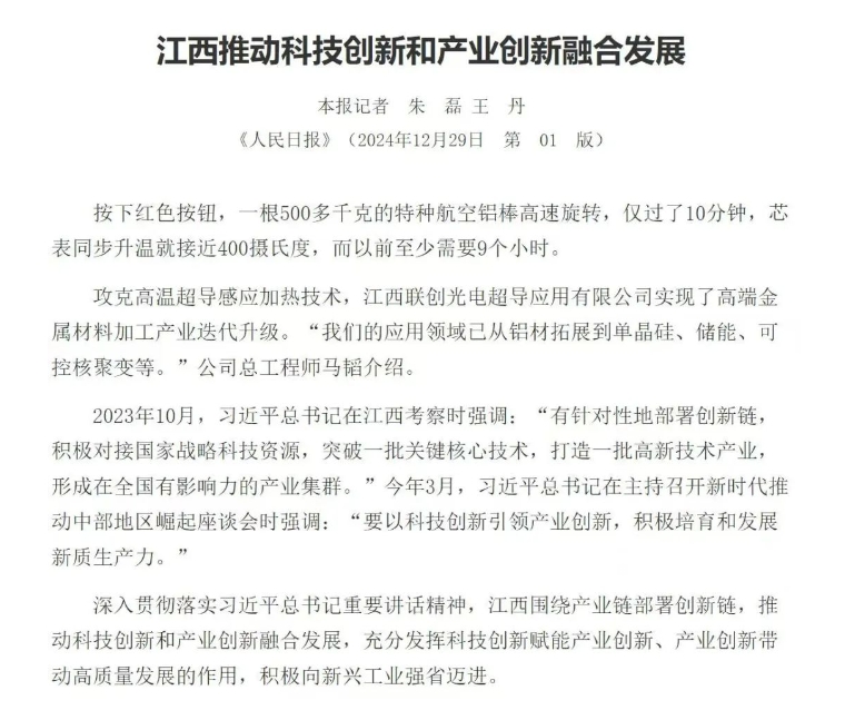 攻克高溫超導(dǎo)感應(yīng)加熱技術(shù),江西聯(lián)創(chuàng)光電超導(dǎo)應(yīng)用有限公司實(shí)現(xiàn)了高端金屬材料加工產(chǎn)業(yè)迭代升級(jí)?!拔覀兊膽?yīng)用領(lǐng)域已從鋁材拓展到單晶硅、儲(chǔ)能、可控核聚變等?!惫究偣こ處燅R韜介紹。