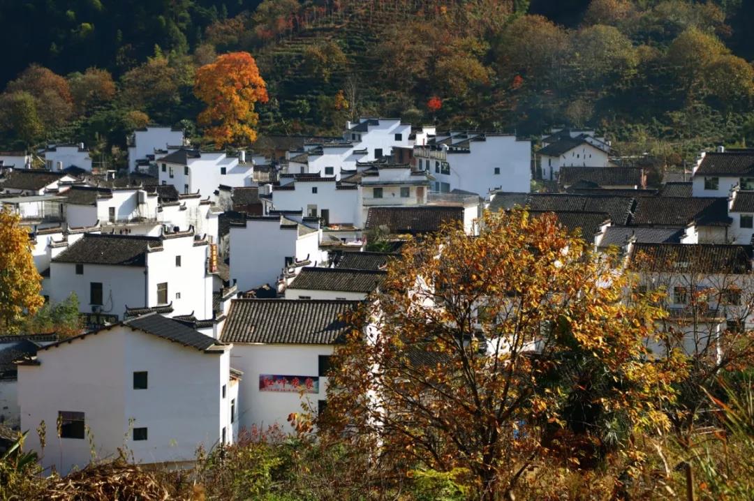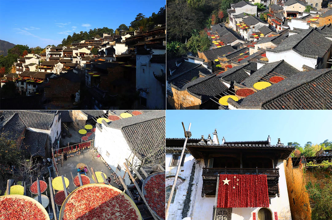 每當(dāng)日出山頭,晨曦初照,整個山間村落間,那飽經(jīng)滄桑的徽式民宿的土磚外墻與長長木架上,圓圓的竹匾里五彩繽紛的豐收果實(shí)排列組合,繪就出“曬秋”農(nóng)俗景觀,甚是壯觀。